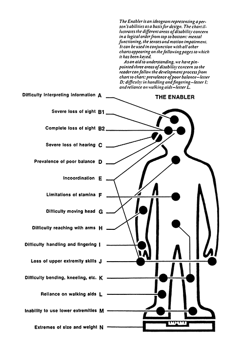 Discussing the origins of this trend in the 1970s, Williamson writes “Rolf Faste, a design professor at Syracuse University, developed a new chart linking parts of the body to design features. This chart, called ‘The Enabler,’ differed in look and logic from earlier human factors charts based on a select anthropometric spectrum... His charts emphasized the overlaps among impairments, showing, for example, that difficulties in comprehension, sight, and mobility all corresponded to design strategies for hand controls and buttons... In focusing on limitations, rather than a ‘typical’ 95 percent of bodily dimensions, ‘The Enabler’ sought design improvements that could potentially improve function for all users.” Read Williamson’s complete article online at www.jstor.org ▸ |